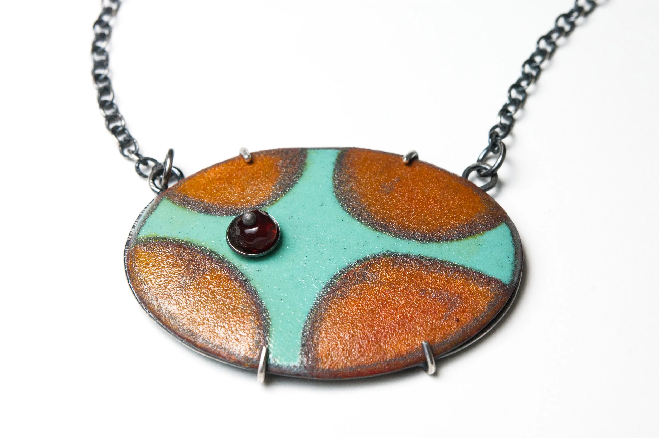 Steel is a very strong and durable material to enamel on in thin gauges. The earrings pictured below were made with 26 gauge enameling iron (a form of low carbon steel). This wouldn’t be possible with copper in that thin of a gauge because it is inherently soft, making it prone to warping and chipping. Making earrings this large and flat in copper would require using 22 gauge at a minimum, and that would make them far too heavy for the average customer.